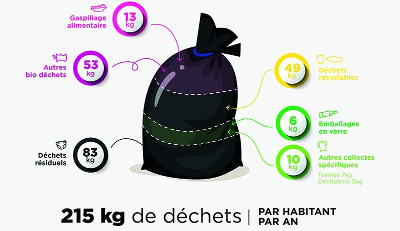 La matière organique (gaspillage alimentaire + autres déchets de cuisine) représente un tiers du contenu de notre poubelle. Tous ces déchets de cuisine peuvent être facilement valorisés s’ils sont extraits de notre poubelle (composteur/sac dédié).